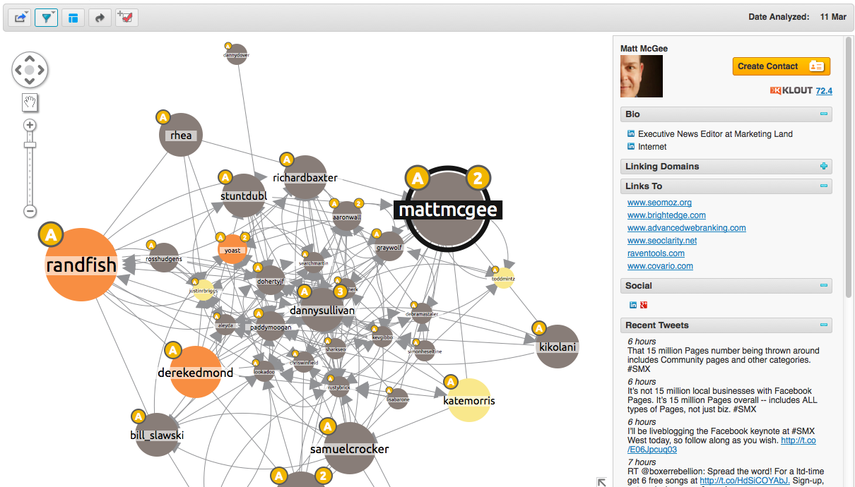 Looking at the Network Analysis, we can see a small section of the SEO community and how they're connected. The circular ‘nodes’ denote the people in the network, the size denoting how influential they are. These can be selected too – like Matt McGee in the example – to reveal more information about that person, including the domains they link from and to, their social profiles, recent content and more.