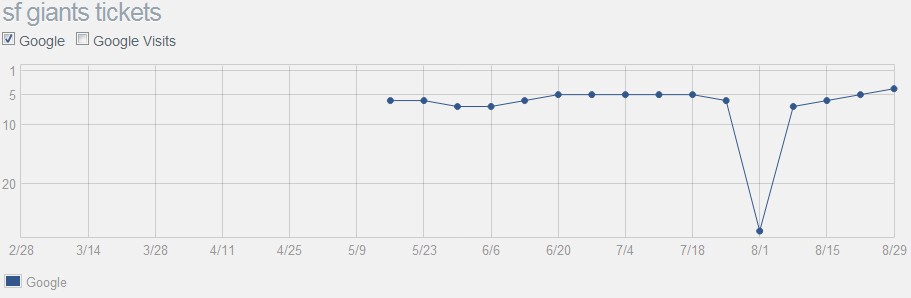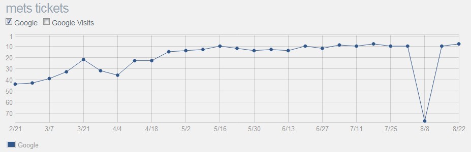 On Monday 8/1, I was searching Google for 'mets tickets' and saw that SeatGeek had slipped from page 1. Worse, we weren't even on page 2. I tried a few more queries that I knew we should be on page 1 for and still nothing. My heart was beating. Had we been Panda'd? It didn't make sense, but I was panicked. Then it hit me. I opened up our New York Mets page, but, just like Mike Mcd, I knew before I even clicked view source...content="noindex" on all of our product pages.