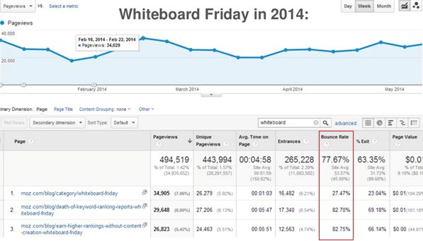 When we look at Moz's own Google Analytics for Whiteboard Friday, we can see that they often see bounce rates of over 80%. While I don't know for sure (such is the uncertainty surrounding bounce rate as a metric), I'd be willing to bet that far more than 20% of visitors to the Whiteboard Friday pages are interested and engaged with what Rand has to say.