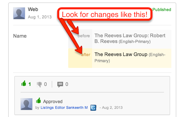 Once you have clicked on this, it will show the entire edit history. Look for edits to the NAP over the time the listing has been live. In the example below, you can see how the business name was actually changed at one point. This is the business name I will want to record in my spreadsheet (the old one).