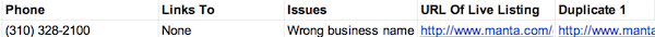 In the example above, I have the correct business information at the top of the spreadsheet in green for easy reference and the incorrect variations in red. You will want to record every variation you find here to make our job a little bit easier moving forward. But how do you find the incorrect variations for your client or business?