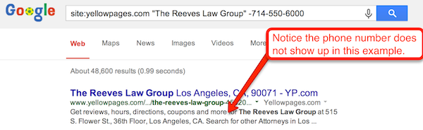 Example: 800-644-800 -714-550-6000 +Reeves Law Group At first glance this search operator probably looks like the one above with the simple addition of +reeves. However take a closer look and notice how I took out one "0" from the 800 number. What I am doing here is looking for a possible wrong entry but also making sure that part of the company name (in this case The Reeves Law Group) is shown in the string.