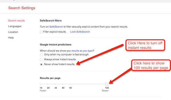 Start by pulling up Google.com and clicking on the gear icon in the upper right hand corner of a search page. You will want to navigate to search settings where you will check the button "Never Show Instant Results" and then change the Results Per Page slider to 100. This will allow you to search 100 entries as a time. You can see the settings we changed in the picture below: