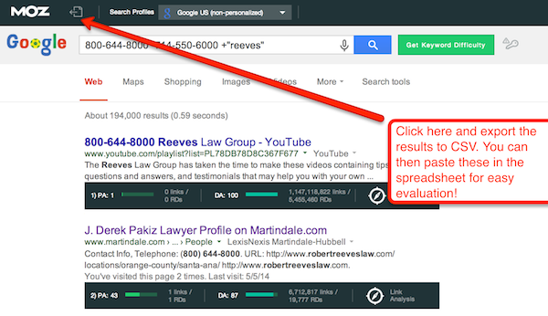 When the MozBar is on and you do a search in Google you will now be able to see 100 results and easily export them by clicking the export button in the top left corner of the MozBar as shown in the example below. Once you have these results you can copy and paste them in my trusty spreadsheet for evaluation. Of course if you're doing a lot of searches I recommend conducting the searches first, combining the results, and then removing duplicates in Excel. This will save you a ton of time!