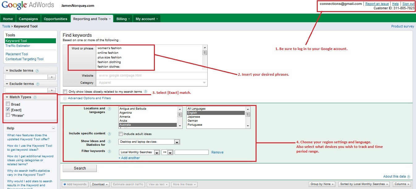 - Sign into the Google Keyword Tool and make sure you log into your Google account. You would be surprised how data is different from beeing logged in and logged out.