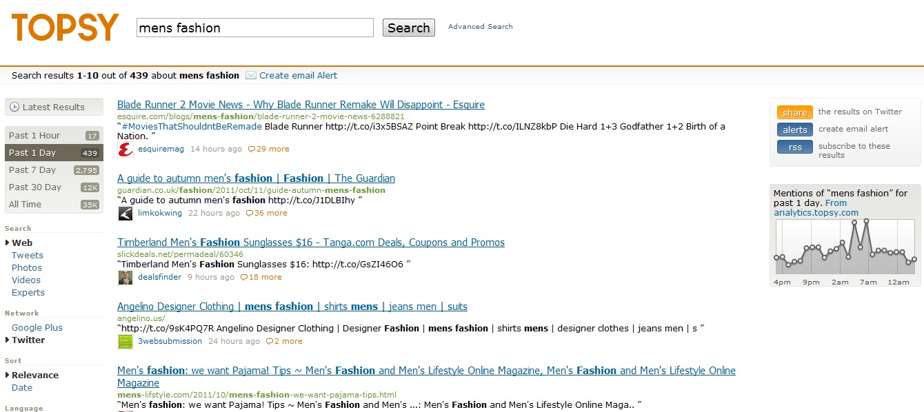 Topsy data is another fantastic source of information for social sharing data. It is advisable to use the "Advanced Search" field.