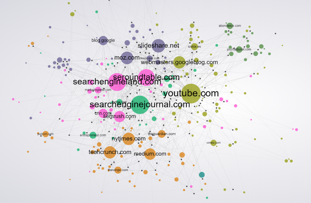 - The size of the nodes is based on Page Rank. This isn’t the Google Page Rank number, but instead the Page Rank within this graph alone. The larger the node, the more authoritative (and popular) that website is within the entire graph.