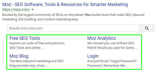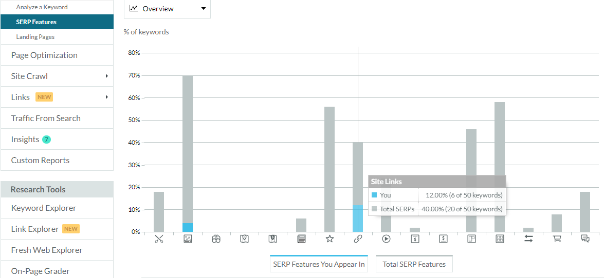 If you’re tracking keywords in a Moz Pro Campaign, you have the ability to see which SERP features (including sitelinks) your pages appear in.