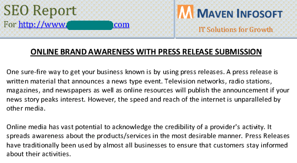 Our approach at Maven Infosoft is to constantly try out any and all tactics applicable to the site/brand and possible within budget before zeroing in on the ones that work best. These activities largely come from within the list/breakdown that we agreed with the client at the outset. Please bear in mind that the SEO strategies (such as PR/article/directory submission, increasing PageRank, and others) that I’m going to use in my examples here only serve to drive my point home. Their effectiveness largely depends on what your client needs.