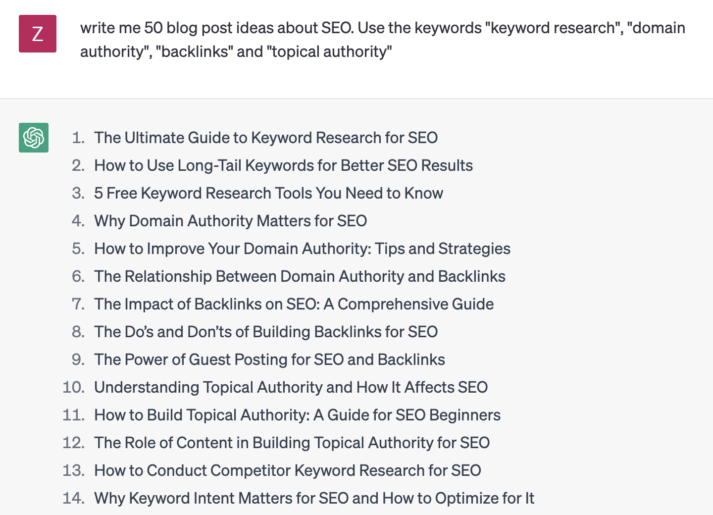 While OpenAI’s free ChatGPT tool does not provide Keyword Volume or other important SEO keyword metrics, it can still be an effective engine for generating content ideas related to a given keyword.