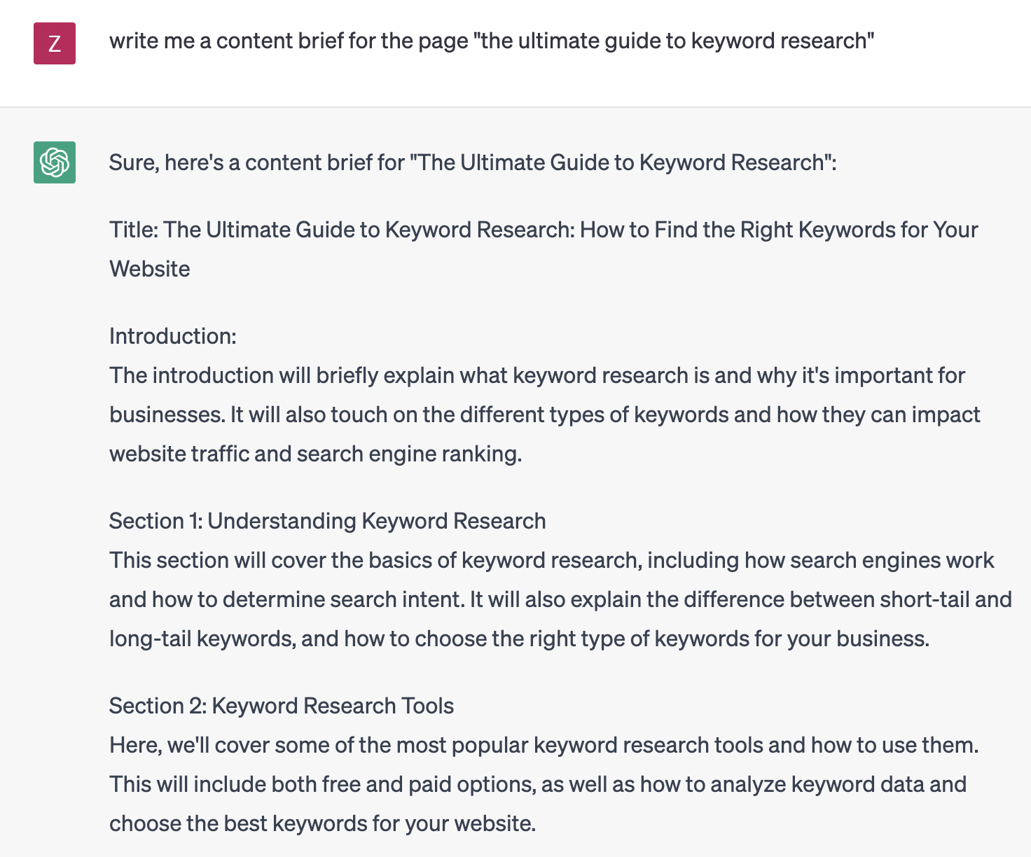 As is a recurring theme with the use of AI for SEO, the results are not perfect, but they can generate ideas for you to take and run with. For example, you may realize that this outline does not get into the concepts of Search Volume or Keyword Difficulty, which you wanted to address on your page. You can tweak your prompt to specify a few additional keywords that you’d like to include, or manually edit ChatGPT’s output to suit your needs.