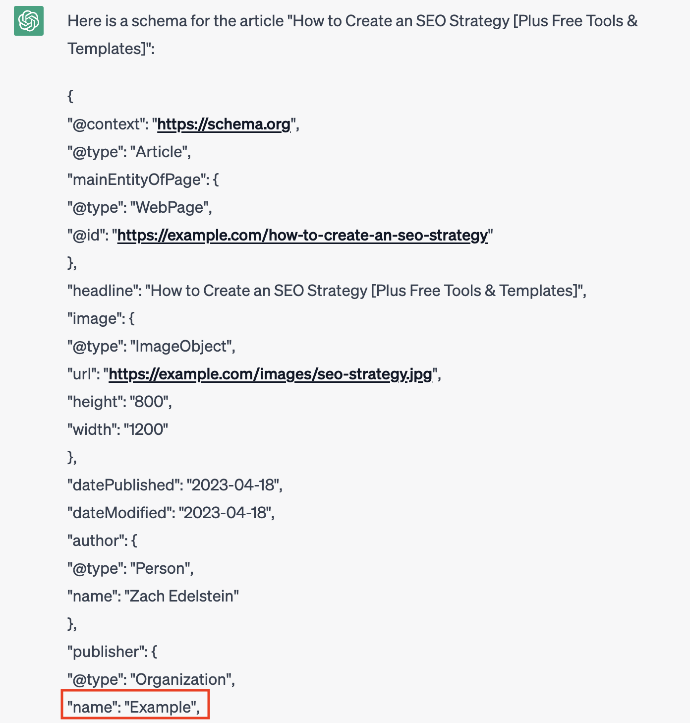The response is a block of schema code that you can paste into a validator. Note that the response was not 100% perfect, hence the need to QA. ChatGPT missed the name of the publisher organization. Before dropping this code onto the published page in our CMS, I would change the name of the organization from “Example” to “Moz.”