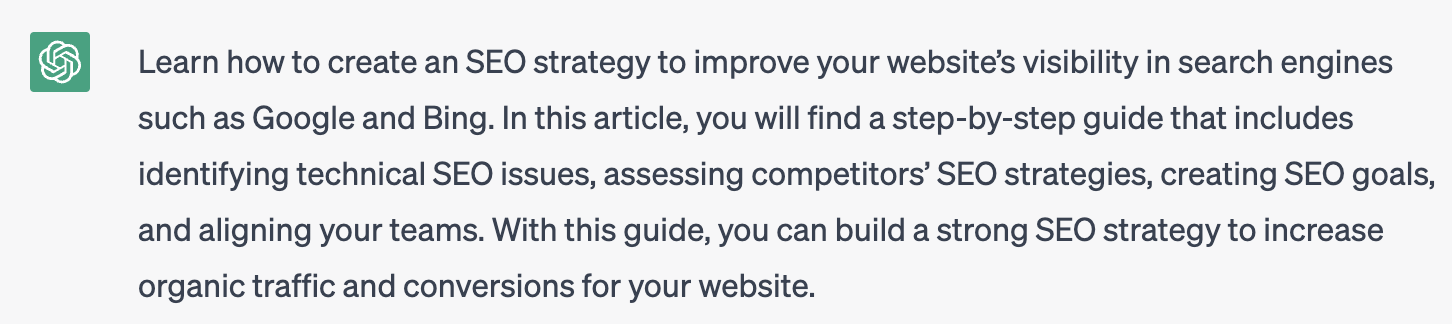 ChatGPT is exceedingly good at taking large amounts of text input and summarizing it. What better way for SEOs to utilize AI’s summarization capabilities than generating meta descriptions? Since meta descriptions are inherently summaries of pages, natural language processing (NLP) models do a good job of extracting the main ideas from multiple paragraphs of text and condensing them into one.