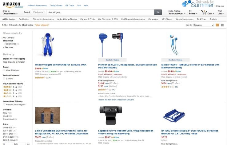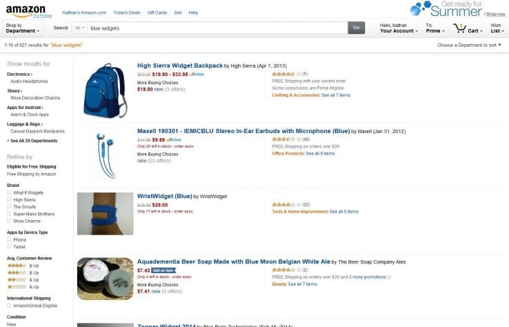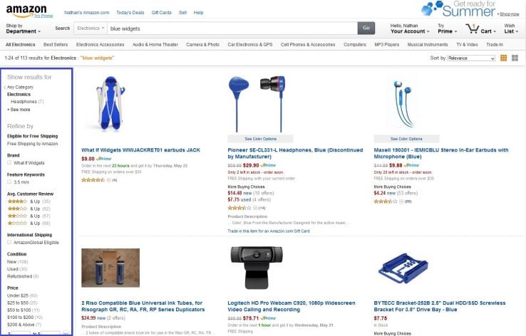 Some other important elements of the results page are the filter fields in the left sidebar. When a user clicks on a filter, they will see a subset of the original search results. This is one reason why it is so important to complete as many fields as possible when you create a product in Amazon. For instance, Amazon will not know that a blue widget is blue if you don't fill out the color map field, which means it will be excluded when a user filters to only show blue products.