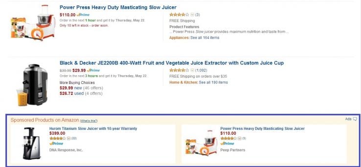 Finally, there are sponsored products. These are pay-per-click results that show up on the bottom of a search results page. In my experience, if I would like my ad to appear for a specific query, I must include all of the words in the query somewhere in my title or bullet points.