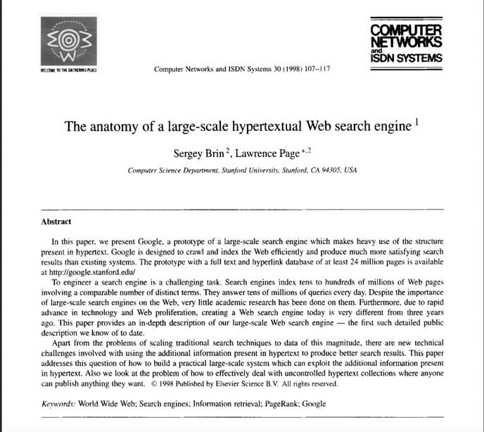 Google was born in 1998 through a Ph.D. project by Lawrence Page and Sergey Brin. It was the first search engine of its kind designed to crawl and index the web more efficiently than any existing systems at the time.