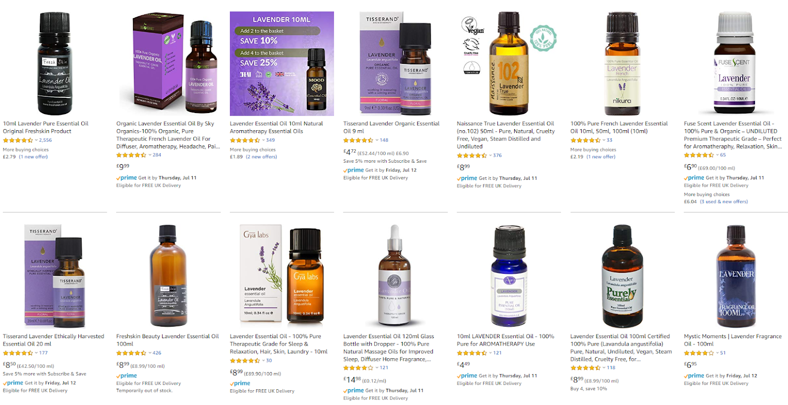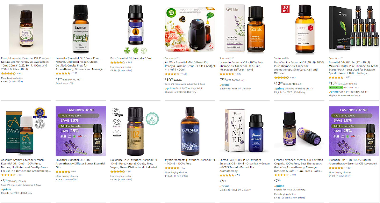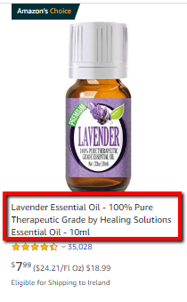 However, Amazon knows that price isn’t the only factor that drives sales, which is why Amazon’s first page isn’t simply an ordered list of items priced low to high. See the below Amazon UK search results for “lavender essential oil:”