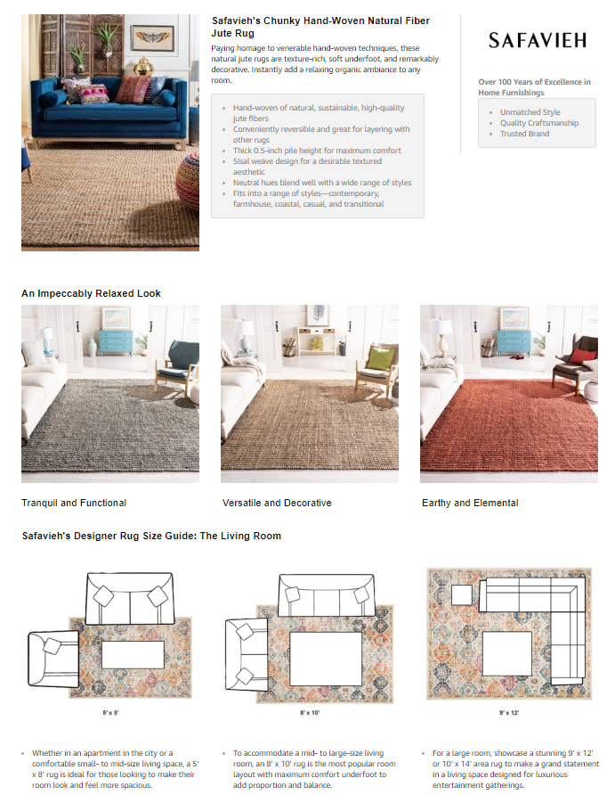 Taking advantage of A+ content for some of your best selling products is a great way to craft a visually engaging description, like this example from Safavieh.