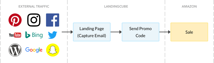 With a landing page tool, you drive traffic to a landing page where customers get a special offer code to use on your product listing page—this way, you only drive traffic which is guaranteed to convert.