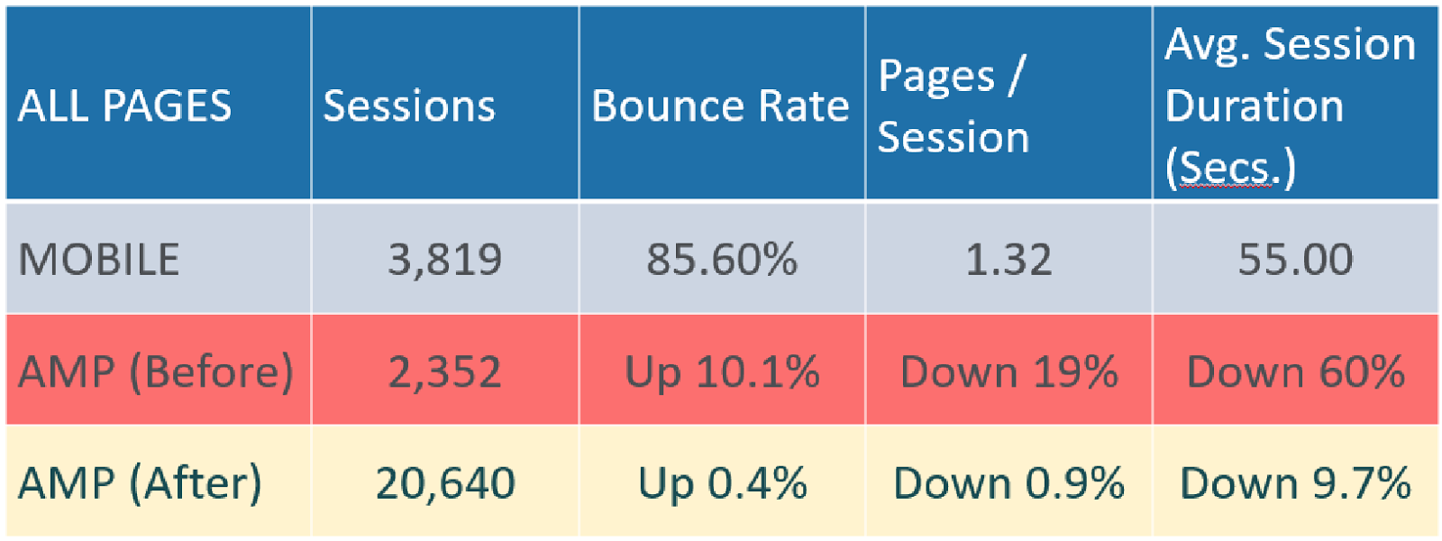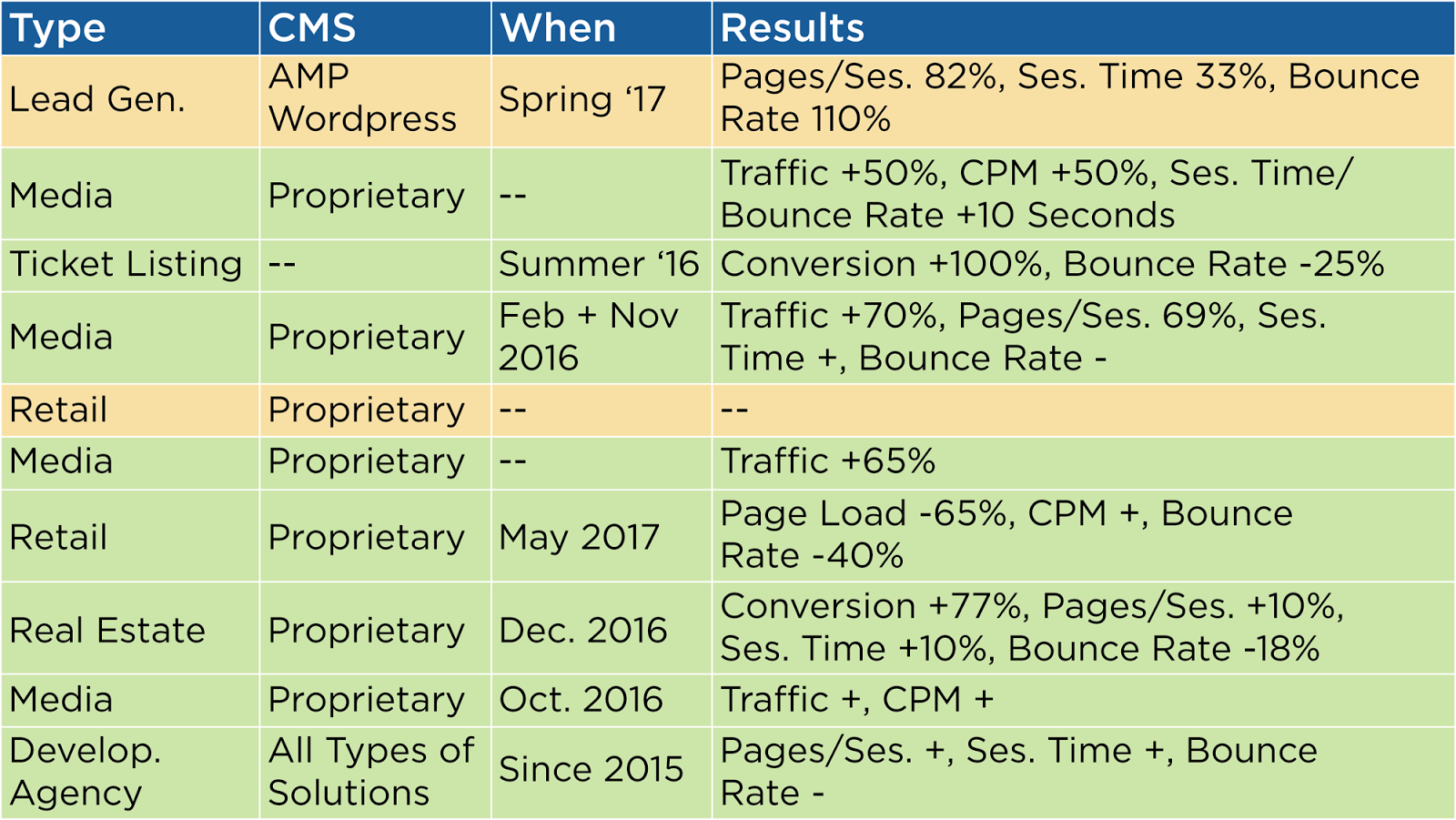 From our research, you can see in the slide below the results from the 10 sites that adopted AMP. Eight of those sites are colored in green, and those are the sites that saw strong results from their AMP implementation.