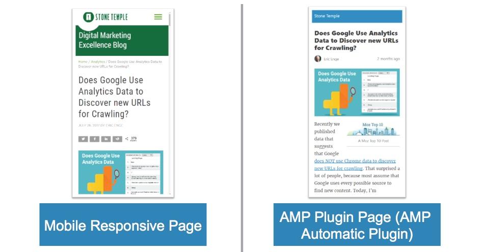 Below you can see a comparison of the standard StoneTemple.com mobile page on the left contrasted with the default StoneTemple.com page that comes out of the AMP plugin that we used on the site called AMP by Automatic.