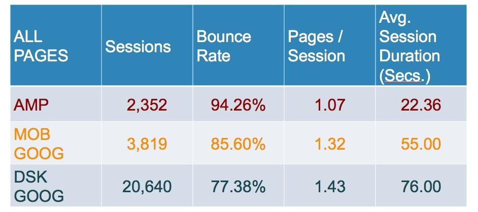 Looking at the middle line highlighted in orange, you’ll see the standard mobile page metrics. On the top line, you’ll see the AMP page metrics — and they’re all worse: higher bounce rate, fewer pages per session, and lower average session time.