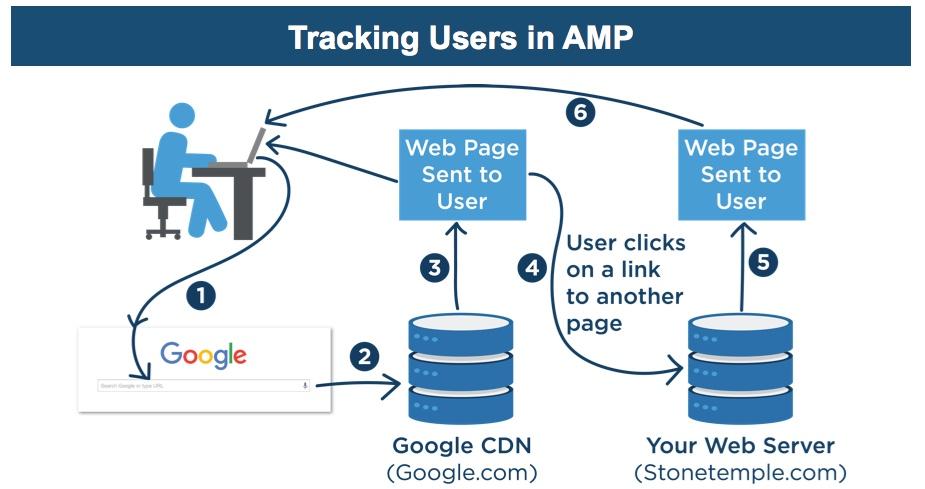 From a web analytics point of view, those are two different websites. The analytics for StoneTemple.com is going to view that person who clicked on the AMP page in the Google cache as a visitor from a third-party website, and not a visitor from search. In other words, the analytics for StoneTemple.com won’t record it as a continuation of the same session; it’ll be tracked as a new session.