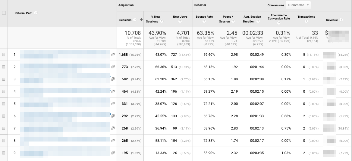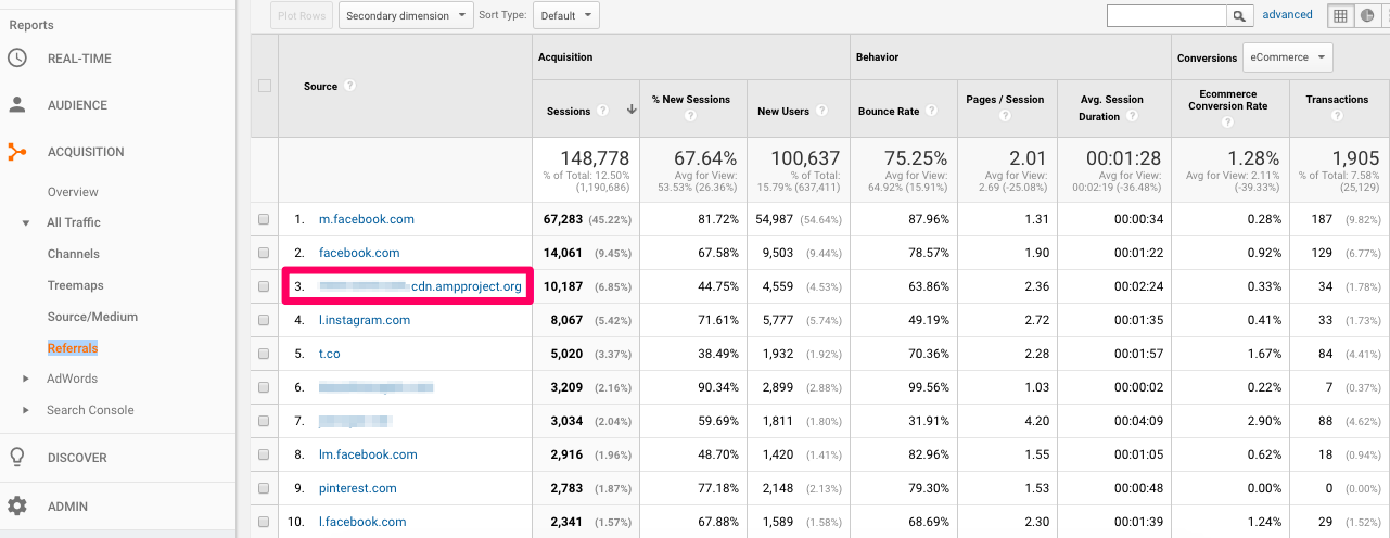 Once we click there, we’ll see the full referring URLs, the number of sessions each URL drove to the non-AMP version of the site, the number of transactions associated with each URL, the amount of revenue associated per URL, and more.