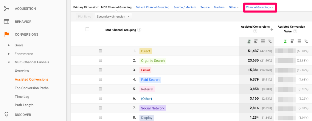 One of the first things that we’ll need to do is create a custom channel grouping within the Assisted Conversions section of Conversions.