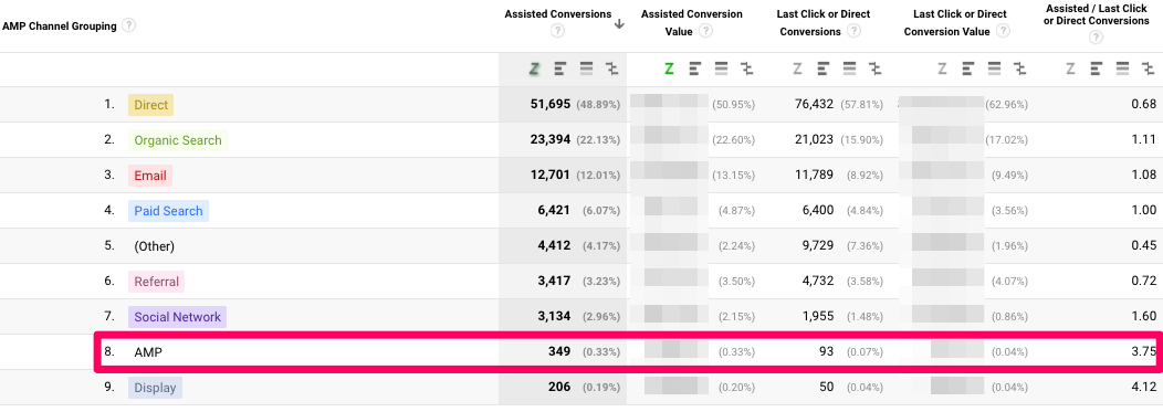 If we really want to have the best understanding of how much revenue and conversions happen from visits to AMP URLs, we need to analyze the assisted conversions report. While you can certainly find value from analyzing the model comparison tool (also found within the conversions tab of GA), if we want to answer the question, "How many conversions and how much revenue are we driving from AMP URLs?", it’s best answered in the Assisted Conversions section.