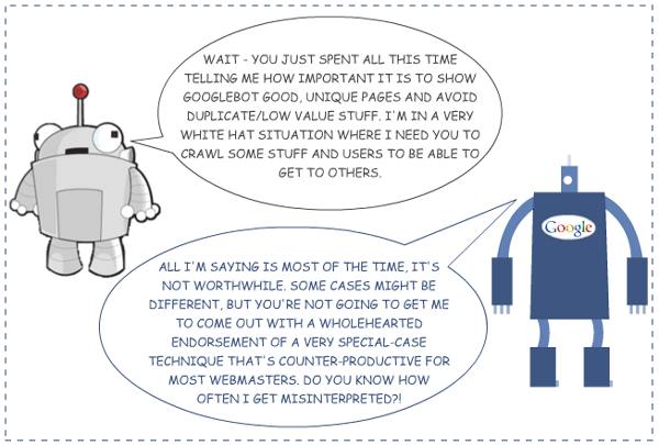 Personally, I liked how much Eric pushed Matt with scenarios that would require some advanced methods of showing faceted navigation to users but not search engines. However, I also understand that Matt needs to take a position that's right for 95% of site owners 95% of the time or risk creating a new "PR sculpting" issue.
