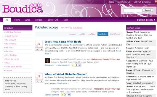 - The site transcends beyond social news and focuses on the community. Though I haven't delved too deeply into Boudica, there's plenty for me to do here. I can send private messages to other members, post a blog entry, submit stories to the social news section, scrawl a quick message on the "Scrawl Wall," and interact with members beyond simply adding them to my friends list. The various features are a nice change of pace from other social news sites--Boudica encourages participation and discussion, and it seems to reward/appreciate users who put a lot of time and effort into using the site.
