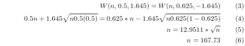 The null hypothesis is that nofollow wins at p = 0.5 (even odds). To reject the null hypothesis in favor of the hypothesis that nofollow is an effective PageRank sculpting method with 95% confidence, we would need to see a minimum of W(n,0.5, 1.645) wins. How many wins will we see? We are 95% sure to see at least W(n, p, -1.645), where p of the actual chance that nofollow win a given trial. If we are setting a lower bound of p = 5/8 = 0.625 for what we are trying to detect, then we have a lower bound of seeing W(n, 0.625, -1.645) wins (with 95% likelihood) if in fact nofollow is at least that much better. We can set this lower bound on the number of wins we expect equal to the number of wins we need to see to have 95% confidence nofollow is better. After that we can then solve for the number of trials.