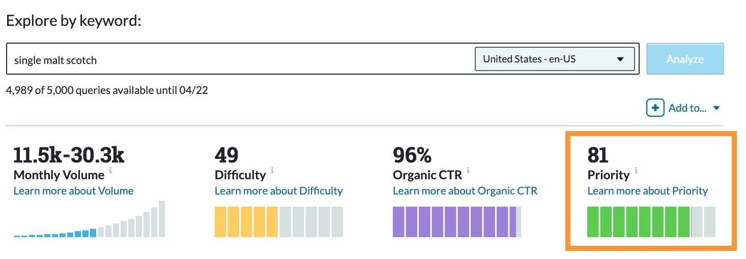 To answer these questions, we do a deep dive into the keyword metrics that help us to prioritize our keyword lists: