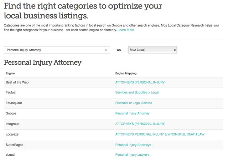 With that in mind, we designed the Moz Local Category Research Tool to be a huge time- and energy-saver. Start typing the keywords or industry your business is in, and we'll start refining the list of categories right before your eyes. Selecting a category will then show you how it maps to different search engines or directories when we publish your listing.