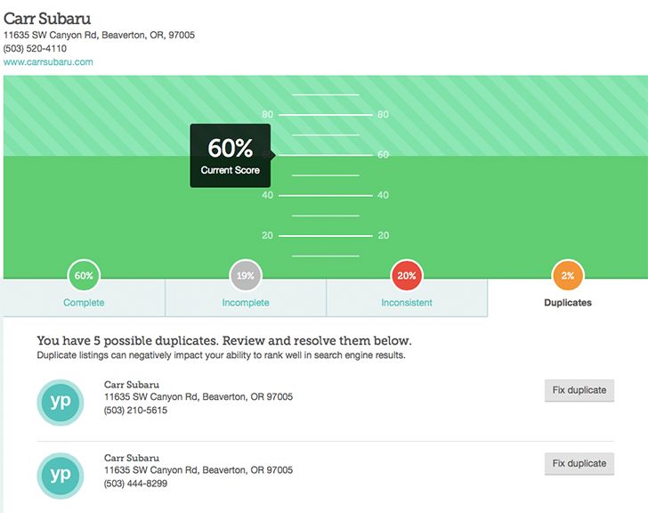 As I mentioned above, we provide reporting on possible duplicate listings in the ecosystem, and where possible, we present you a direct path to closing them. Right now you'll see a relatively tight set of possible duplicates, but going forward you'll see a wider possible set to help you clean up old addresses, changed business names, or unwanted tracking phone numbers.