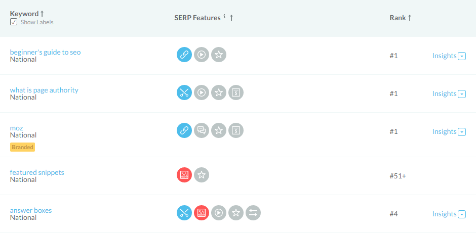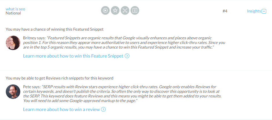 Click on any keyword with "Insights" to see possible opportunities. At launch, we highlight keywords with Featured Snippets, News Packs, Reviews, Videos, and Site Links (if you're not currently listed in them). We hope to add more insights in the near future.