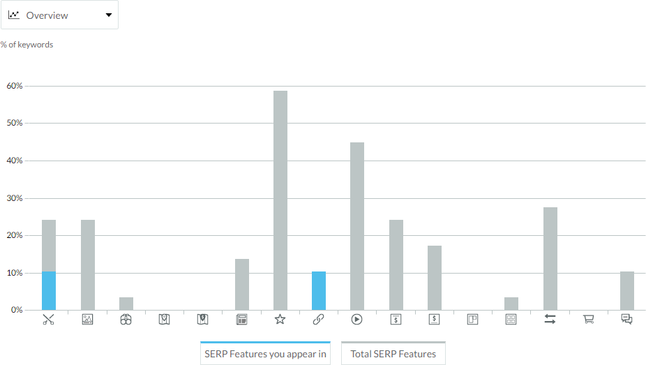 One of the first things you'll see on the new SERP Features page is the overview. This graph shows the presence of features across your campaign, as well as the proportion of features that you're listed in (where applicable). At launch, we support the 16 highest-impact desktop SERP features. Click on the pull-down above the graph, and you can pull up a Trended Analysis for any feature. Good news: we've already got a 60-day history available at launch: