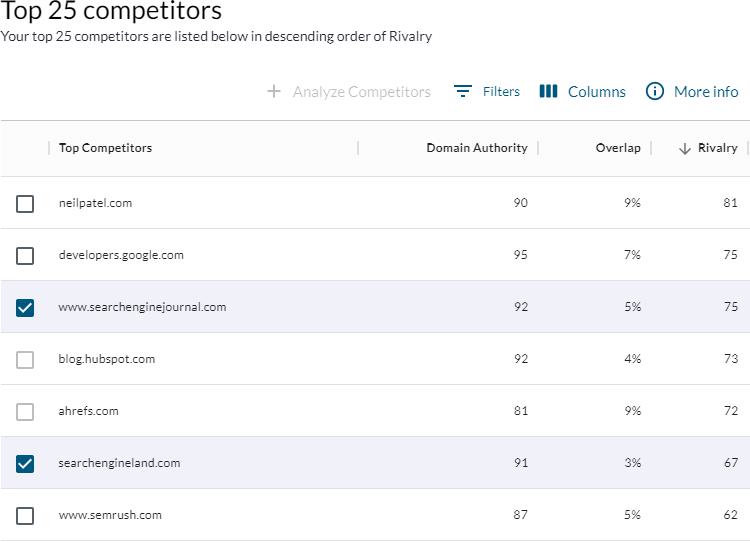 That’s where Rivalry comes in. Rivalry factors in the Click-Thru Rate (CTR) and volume of overlapping keywords, the target site’s ranking (keywords where the target ranks higher are more likely to be relevant), and the proximity of the two sites’ DA scores to help you sort which competitors are the most relevant and realistic.