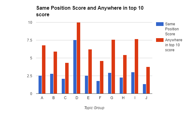 This chart shows the results of the experiment for the 10 topic groups. The blue bars represent the by position score, averaged across each topic group, and the red bars show the average all pages score.