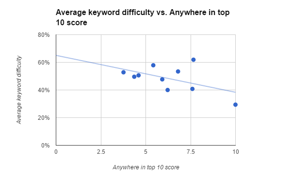 This is not borne out by the data. The higher the keyword difficulty is across the keywords in a topic group, the less similarity there is between SERPs within that topic group. This correlation is fairly weak (R2=0.28), so we can’t draw any conclusions from this data.