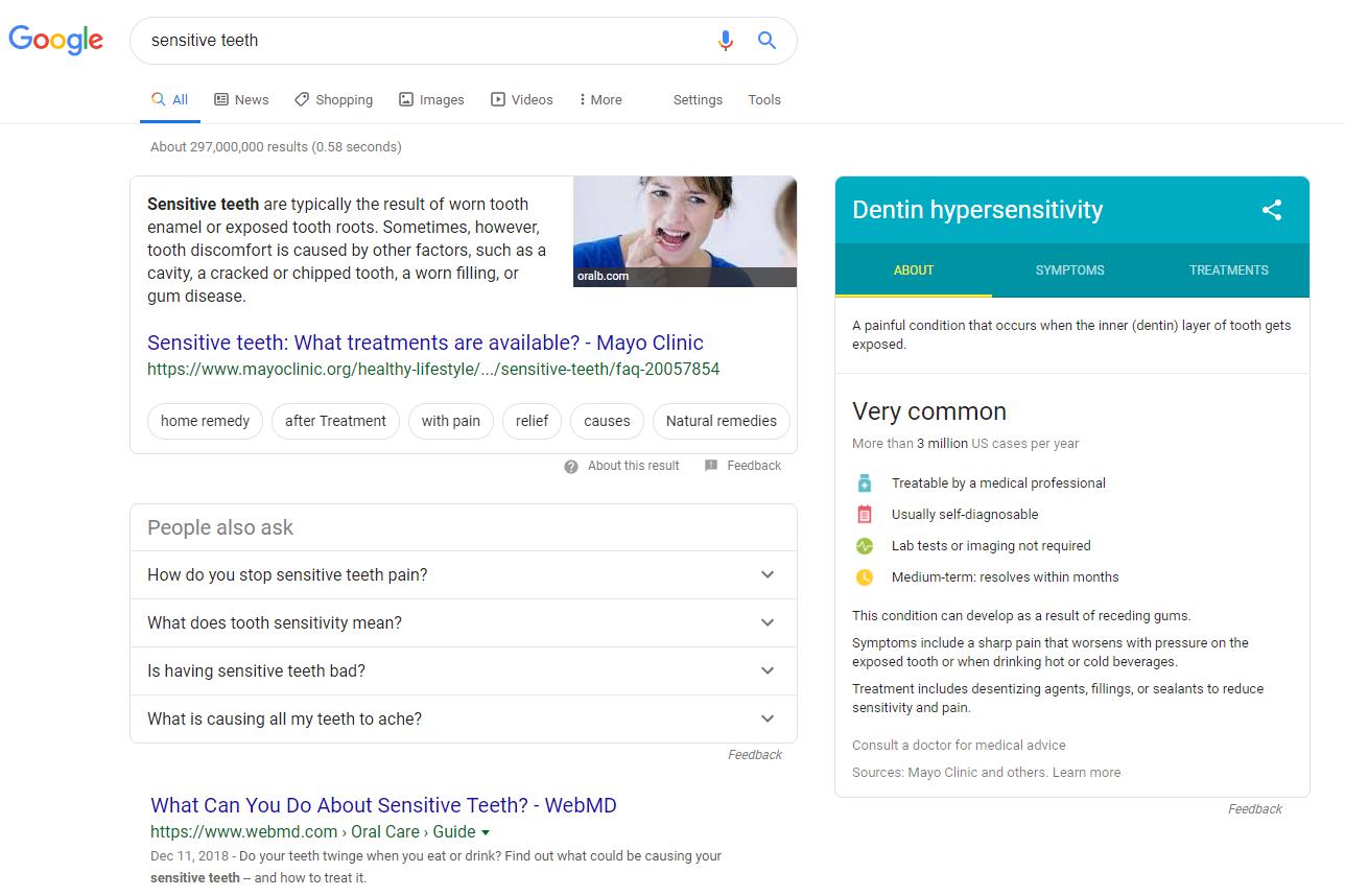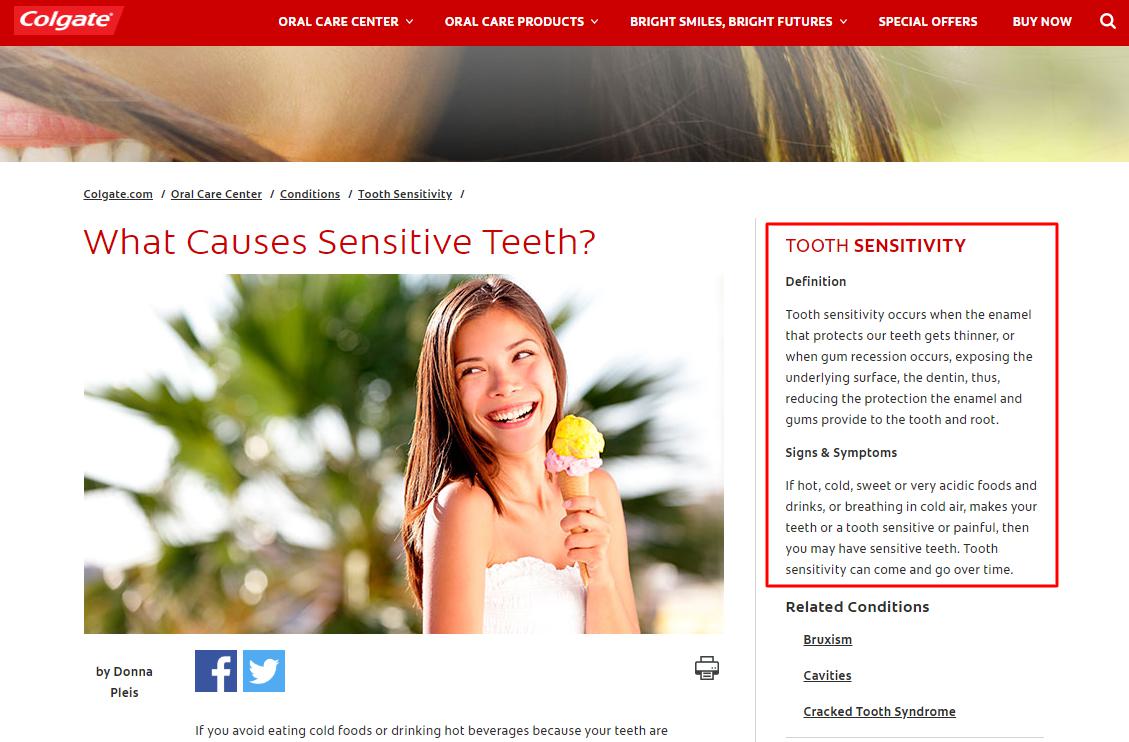 One thing to note, that is likely helping this page rank is the clear definition of “tooth sensitivity” and signs and symptoms listed on the sidebar: