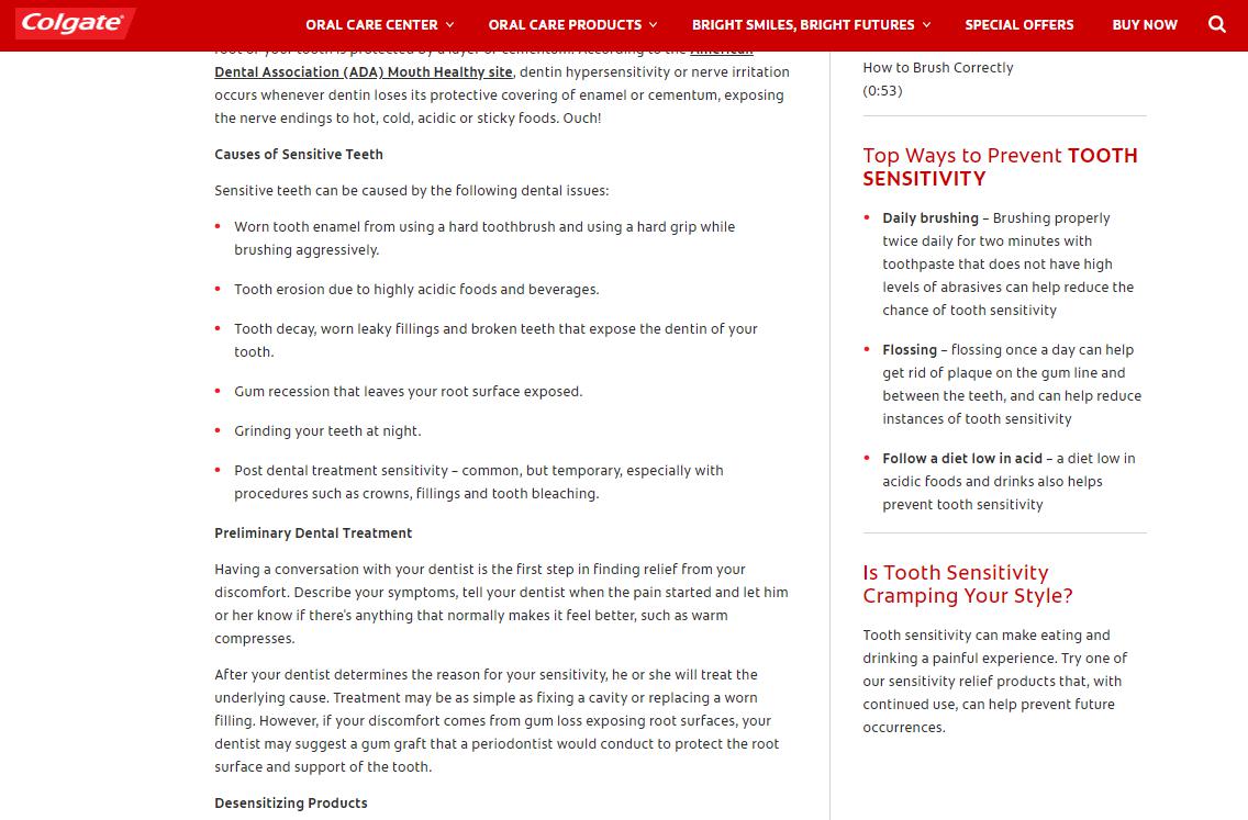 However, this should be a secondary opportunity to [sensitive teeth] and should be mixed in to the copy on the page, but not the focal point. Also, the page one results for [tooth sensitivity] are largely the same as those for [sensitive teeth], including Colgate’s page: