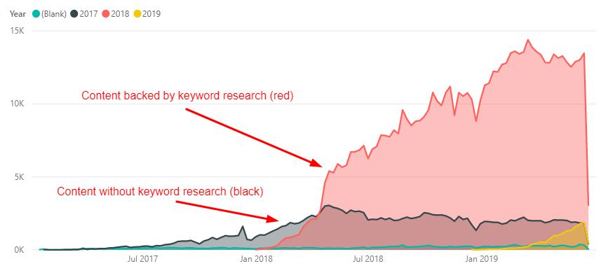 In 2018, we started creating content based on keyword opportunities. The performance of that content has quickly surpassed (in terms of organic sessions) the older pages that were created without strategic research.