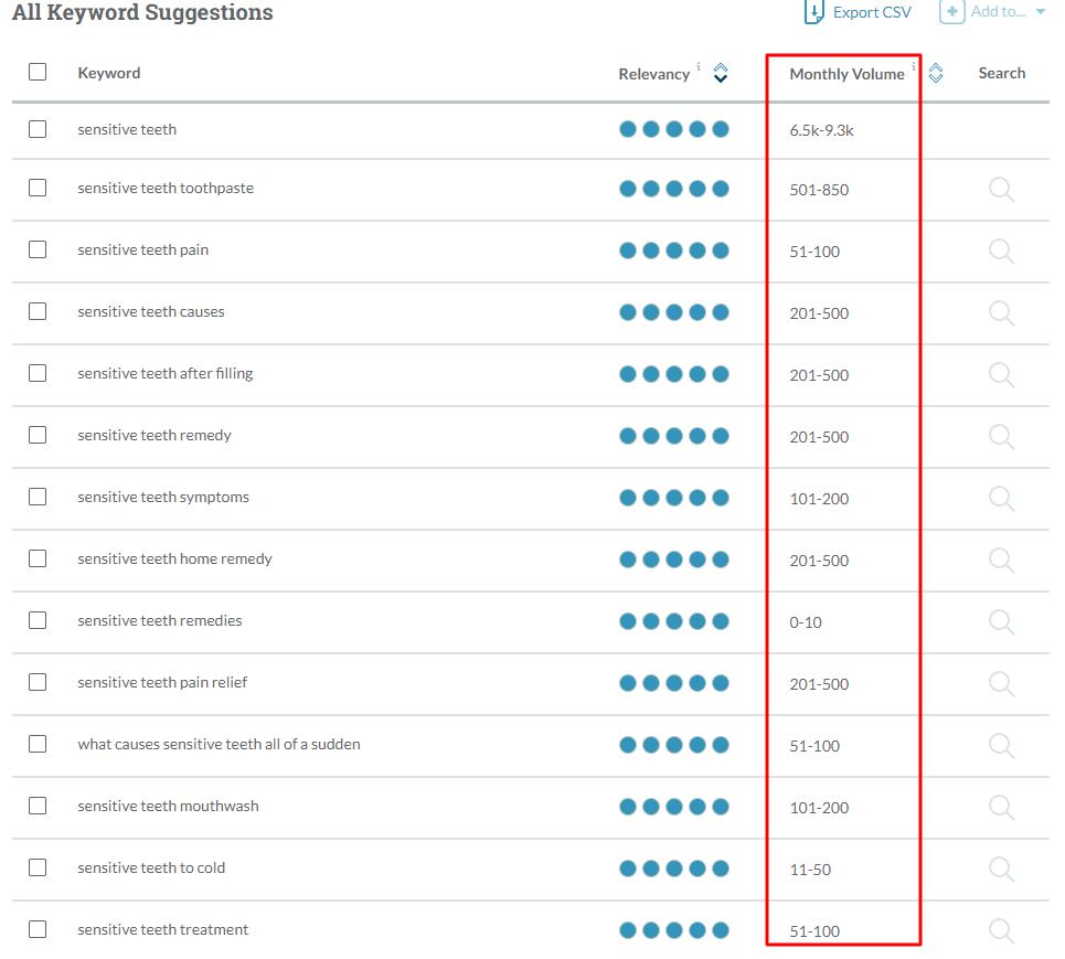 Using Quip as an example again, we can plug in their seed keyword [toothbrush] and get multiple suggestions (MSV = monthly search volume):