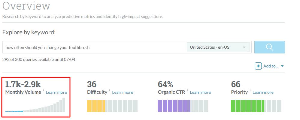 The title of the page isn’t optimized for the main query, and a simple title change could help this page earn more visibility. Moz reports 1.7k–2.9k monthly search volume for [how often should you change your toothbrush]: