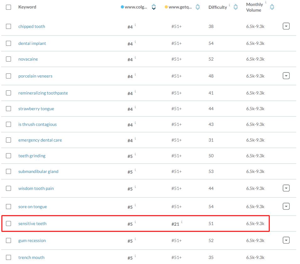 Although many of Colgate’s keywords aren’t relevant to Quip, there are still opportunities to be gleaned here for Quip. One such example is [sensitive teeth], where Colgate is ranking top five, but Quip is on page two: