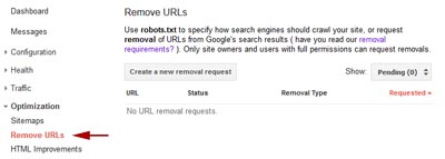 3) For a solution to remove a page quickly from Google’s search, log into Google’s Webmaster Tools. Click the “Remove URLs” tool under the “Optimization” tab then create a new removal request: