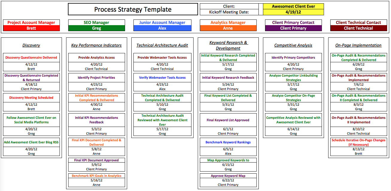 The Process Strategy Template is built to be as flexible or rigid as you need it to me. Because the template is built using Absolute Values for the cell references, you can feel free to add, delete, or move sections of the document without affecting the remaining milestones (unless, of course, you delete a milestone that was a prerequisite for any deliverable due dates). Additionally, you can include as many or as few initial attributes as makes sense for your business to ensure that all team members are clear as to their roles and expectations for the project.