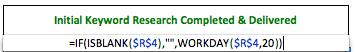 The formula to populate due dates is incredibly straightforward. Simply indicate the prerequisite date ($R$4 in the example below, which refers to the Kickoff Date in our example) and the number of work days to elapse from that pre-req date (20 work days). Remember, we're using the WORKDAY formula - 1 week is 5 days.